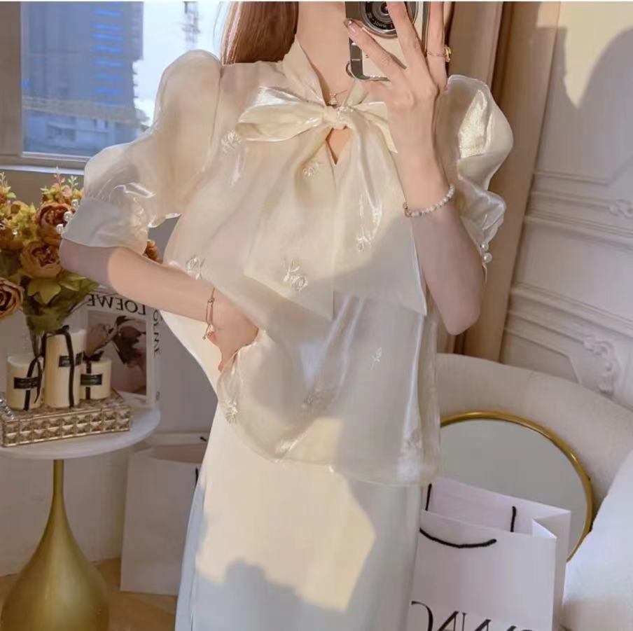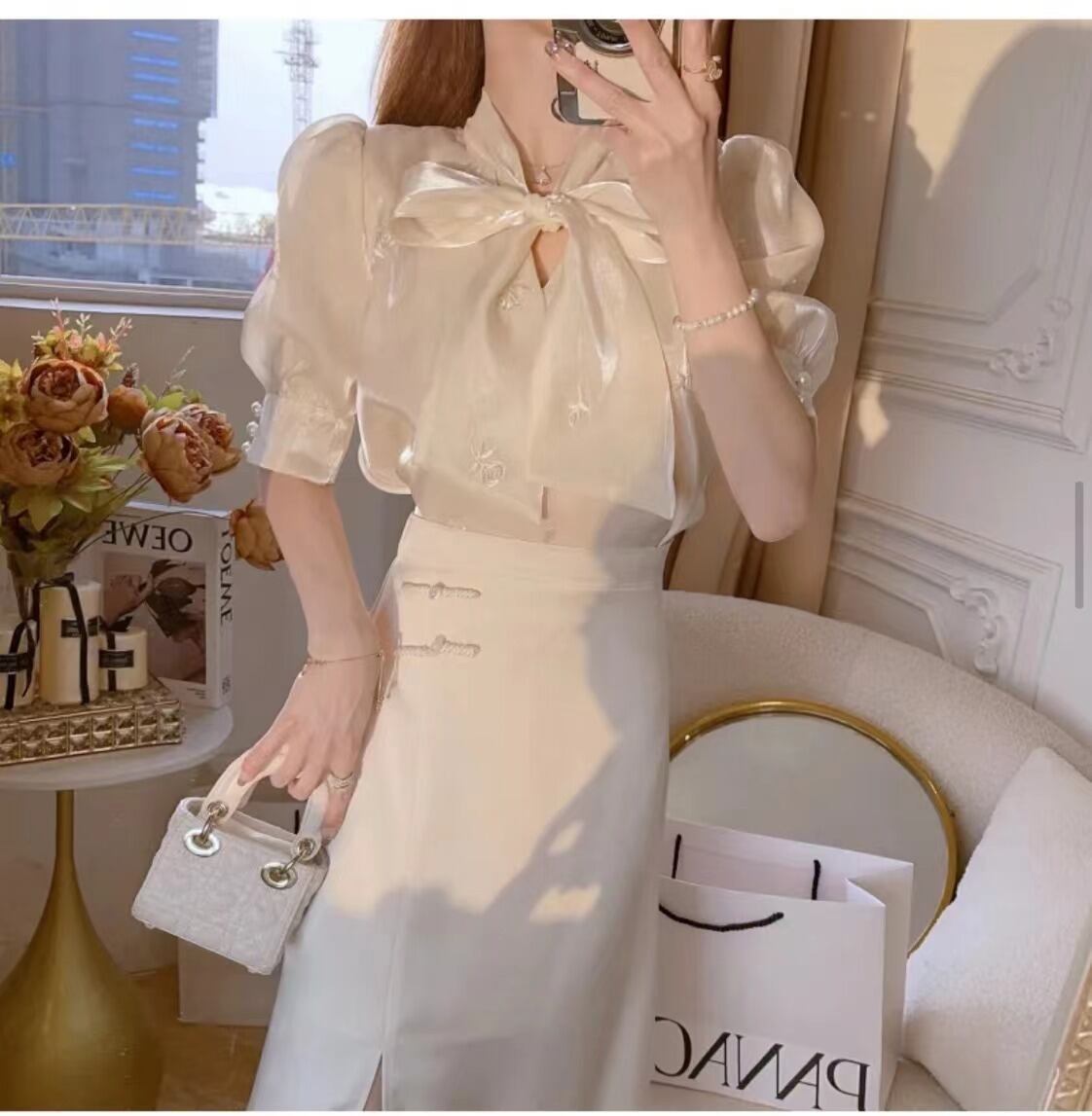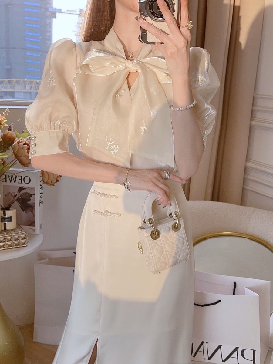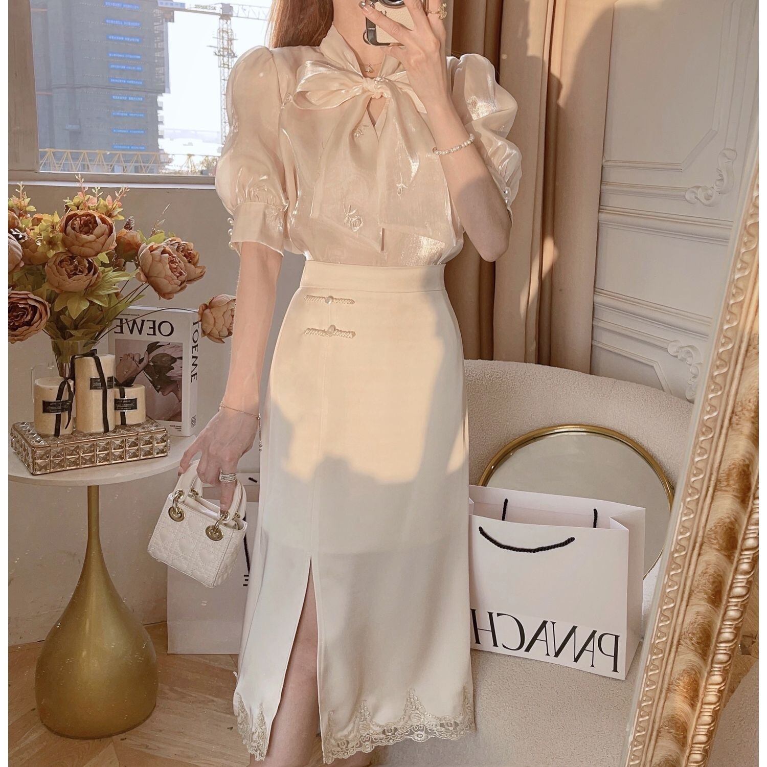 2点セット  ハイウエストaラインスカート 絹 生地トップス