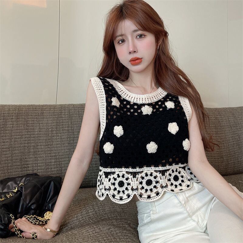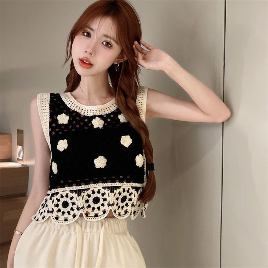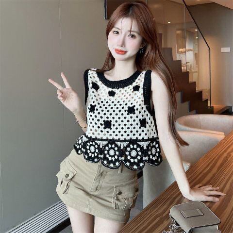 サマーニットタンクトップは、透かし編みとレースが施された夏にぴったりのアイテム。重ね着やレイヤードスタイルにもぴったりで、ドット柄とお花のモチーフが可愛らしさを演出します。暑い季節でも涼しく着られる軽やかな素材で、涼しげな印象を与えます。